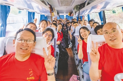 6月6日,在山东省荣成市第二中学,高三考生乘坐“爱心送考专线”前往各考点熟悉考场环境。在2025年高考来临之际,各地采取多种措施,暖心助力高考学子。 新华社发