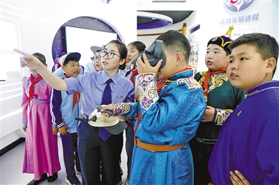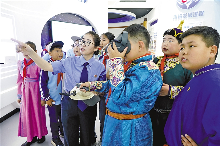 近日,呼伦贝尔市鄂温克族自治旗人民检察院开展了“携手关爱 共护未来”主题检察开放日活动,邀请鄂温克族自治旗第一实验小学70余名师生、家长代表走进该院,“零距离”了解检察职能,感受法治力量。图为同学们通过VR“智慧未检”,学习反校园欺凌、交通安全、禁毒等相关法律知识。本报记者 郝佳丽 摄