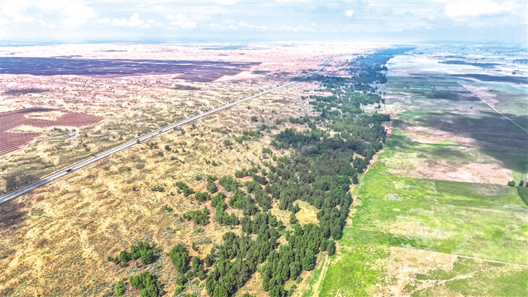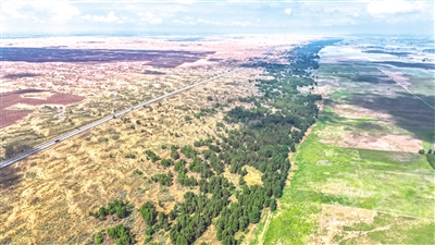 看,风起库布其,绵延的锁边林带如一条翡翠巨龙,迎风而舞、借风起势,守护着黄河“几字弯”的青绿安澜、清波荡漾。