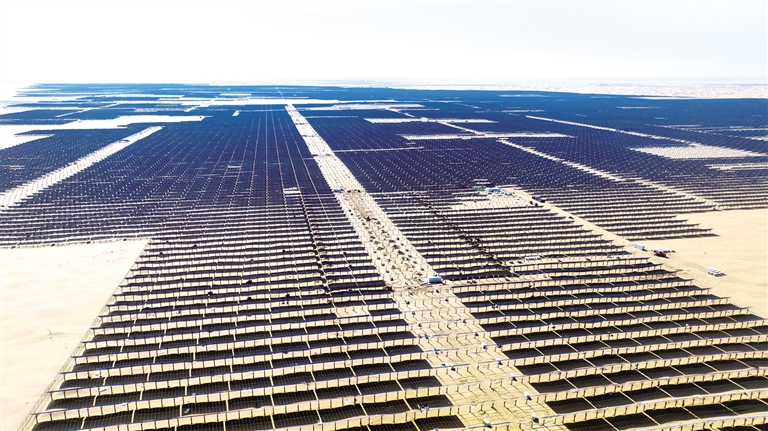 看,光聚库布其,400公里的“光伏长城”围筑出新能源的盆地,绿电蓝海,正在向世界解读中国新时代防沙治沙的华彩新章。