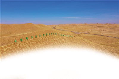 “我们的沙障采取的是1米乘1米规格的稻草方格,沙障铺好后,在方格里种植梭梭进行生物固沙。今年,阿拉善盟将完成锁边林草带空白区431公里治理,补齐防沙阻沙带上的‘缺口’和‘断点’,用1856公里的防沙阻沙带,有效遏制三大沙漠曼延汇合‘握手’之势。”阿拉善盟林草局局长图布新说。