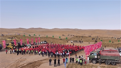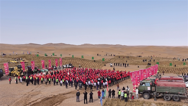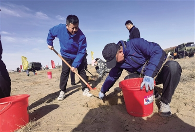 阿拉善盟在全力推进三大沙漠锁边林草带建设工程基础上,今年还广泛发动各族各界群众开启了为期两个月的“万人植绿大会战”,自3月12日植树造林活动启动以来,已有全盟各单位、社会团体和广大群众及适龄学生共14.19万人参与造林绿化任务,种植花棒89.4万株,截至目前已完成17000亩义务治沙任务。