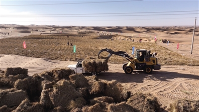沙海起伏,机械轰鸣。连日来,在阿拉善盟巴丹吉林、腾格里两大沙漠交汇处的九棵树治沙区现场一派繁忙,一辆辆满载着稻草的运草车来往穿梭,将稻草源源不断地运到沙漠中,治沙工人们将稻草铺设整齐后,手扶式沙障机快速在沙中压固成一圈圈草方格。而在不远处连绵起伏的沙丘上,沙障机压固好的草方格纵横交错将一个个沙丘分割锁定,登高远眺甚是壮观。