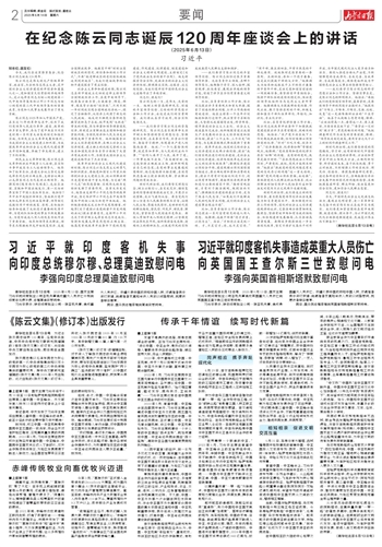 陈云同志的一生,是伟大、光荣的一生。他树立的崇高精神风范、创造的丰富领导经验、总结的科学思想方法和工作方法,永远是我们的宝贵财富。我们要认真学习运用,结合实际发扬光大。