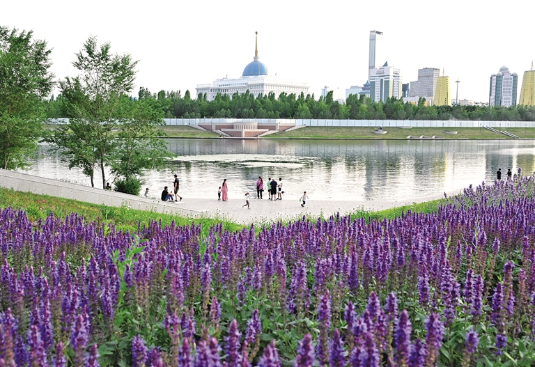 6月13日,人们在哈萨克斯坦首都阿斯塔纳的伊希姆河畔休闲。阿斯塔纳是哈萨克斯坦首都,伊希姆河穿城而过,地标性建筑极具特色。夏日的阿斯塔纳,天气晴好、鲜花盛开,天际线在蓝天白云的映衬下格外美丽。新华社记者 燕雁 摄