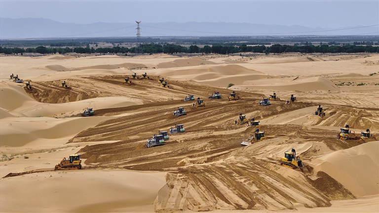 按照规划,未来,该段穿沙公路将公路建设、防沙治沙及新能源产业同步推进,实施沙障固沙1270亩,建设光伏项目用地5.5万亩,光伏装机达180万千瓦,以路治沙成果将铸就形成一条条真正意义上的绿色生态长廊。