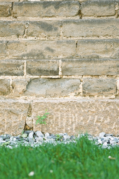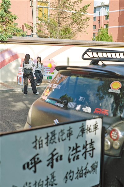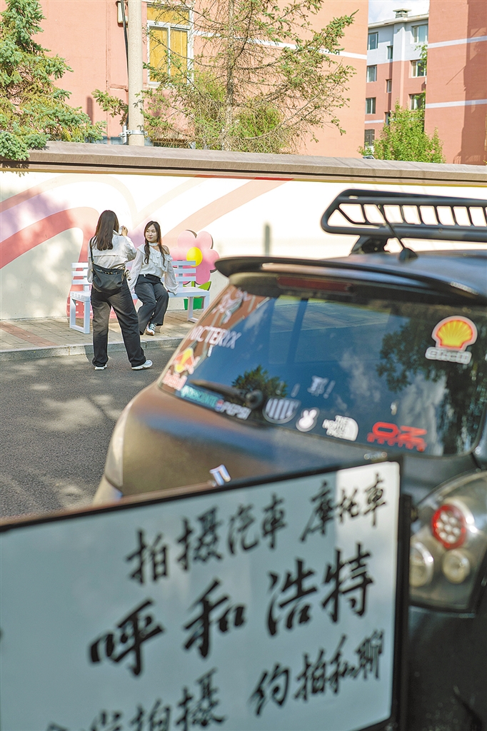 6月16日,呼和浩特市新城区东护城河北街,墙体彩绘前拍照打卡者络绎不绝。墙根处,一株野草从建于清代的绥远城墙砖缝里探出头,与马路对面新潮的咖啡店静静对视。