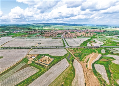 6月19日,航拍镜头下的乌兰察布市丰镇市隆盛庄镇与周边农田、长城烽火台构成一幅独特优美的夏日风景画。隆盛庄镇是全国首批传统村落,被列为中国历史文化名镇。这里具有悠久的历史文化和深厚的人文积淀,是人们了解内蒙古的重要窗口,也是游客市民争相前往的网红打卡地。本报记者 王晓博 摄
