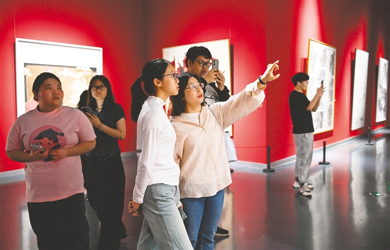 6月22日,观众在内蒙古美术馆参观民族美术作品。近日,为期1个月的第六届中国民族美术作品展览巡展(呼和浩特站)在内蒙古美术馆开展,展出近300件作品,涵盖中国画、油画、版画等多个门类,全方位展现了各民族多彩的生活面貌。本报记者 王磊 摄