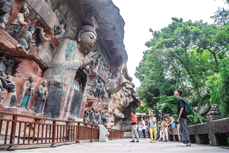 6月24日,游客在大足石刻景区参观。大足石刻位于重庆市大足区,始凿于初唐,是重庆市唯一的世界文化遗产。近年来,当地将数字技术运用于大足石刻保护工作,为这一世界文化遗产的活化利用注入新活力。目前,大足石刻已有75处文保单位实现数字化信息采集全覆盖,初步完成数字档案建设。同时,大足石刻景区运用人工智能、云计算、大数据等技术创建“智慧景区”,打造8K球幕电影、VR体验等项目,丰富游客体验。