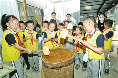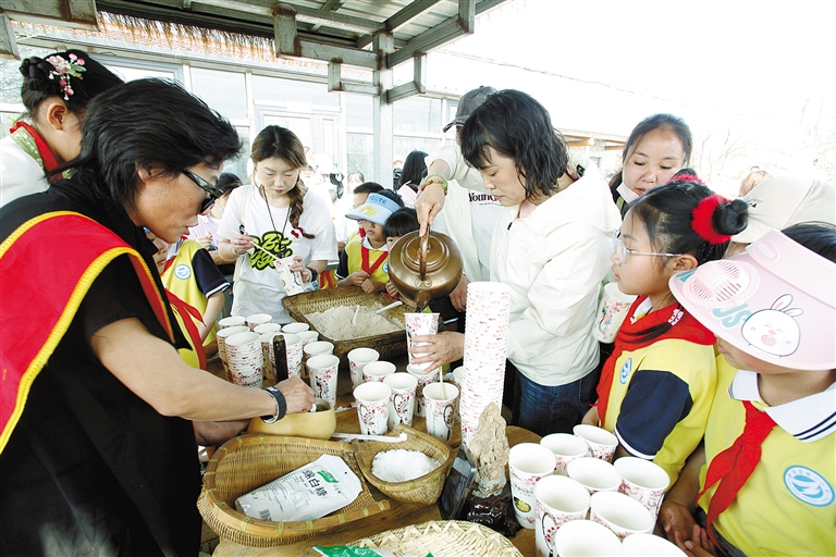 在乡土文化体验区,自治区级非物质遗产代表性项目莜面饮食制作技艺传承人郝智霞现场展示飞箩炒面工艺。铁锅中金黄的莜麦翻滚飘香,一杯杯创新研发的速溶莜面饮品递到孩子手中。郝智霞一边演示一边介绍,非遗美食的创新转化不仅留住了“舌尖上的乡愁”,更让孩子们直观感受到中华优秀传统文化的生命力。