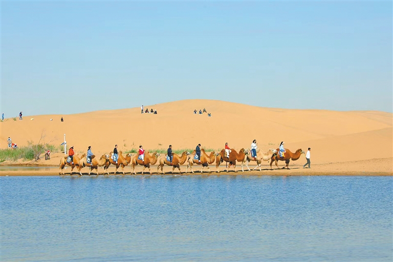 盛夏时节,漫步美丽的乌海湖畔,金色的乌兰布和沙漠与湛蓝的湖水相映成趣,一湖诗画尽揽入怀。近年来,乌海市结合乌海湖景区大湖、大漠的资源优势,开发了水上环湖观光游、沙海体验游、小火车观光游等旅游路线,并拓展了游艇、快艇、水上飞人、沙漠越野车、沙漠骆驼等20余种水上沙漠娱乐项目,“来沙漠看海”成为乌海市最为响亮的旅游标语。