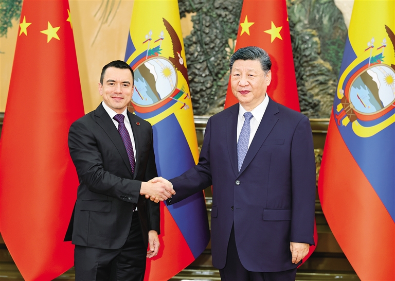 习近平指出,今年是中厄建交45周年,两国关系发展势头良好。厄瓜多尔加入共建“一带一路”大家庭,双方签署自由贸易协定,在能源、矿业、电力、基础设施建设等领域开展了富有成效的合作。中方始终从战略高度和长远角度看待和发展中厄关系,愿同厄方一道努力,推动中厄全面战略伙伴关系不断走深走实,更好造福两国人民。