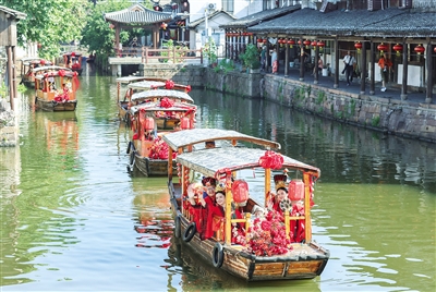 6月28日,新人乘坐婚船游览新市古镇。当日,浙江省湖州市16对新人在德清县新市古镇举行传统形式集体婚礼,倡导婚事新办简办,演绎“中式浪漫”。 新华社发