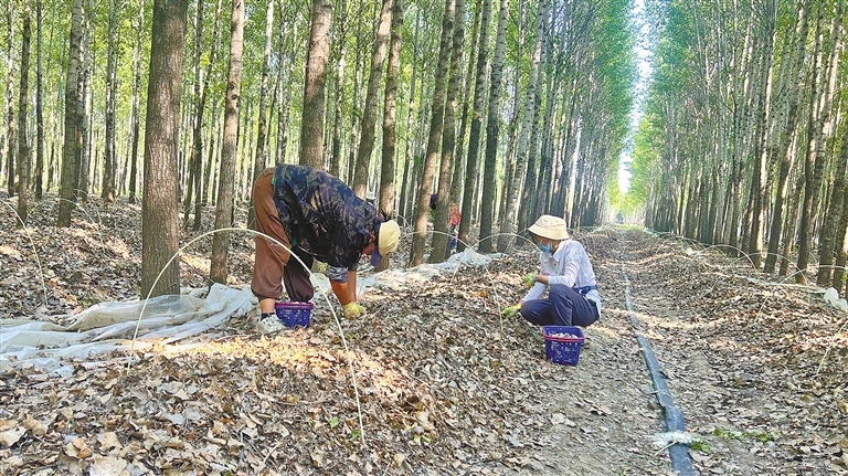 赤松茸,学名大球盖菇,是一种名贵的食用菌。“我们从5月20日开始采摘,产出周期一直能持续到7月中下旬左右,总产量预计达12万斤,纯收入近15万元。” 沈奎伟说。