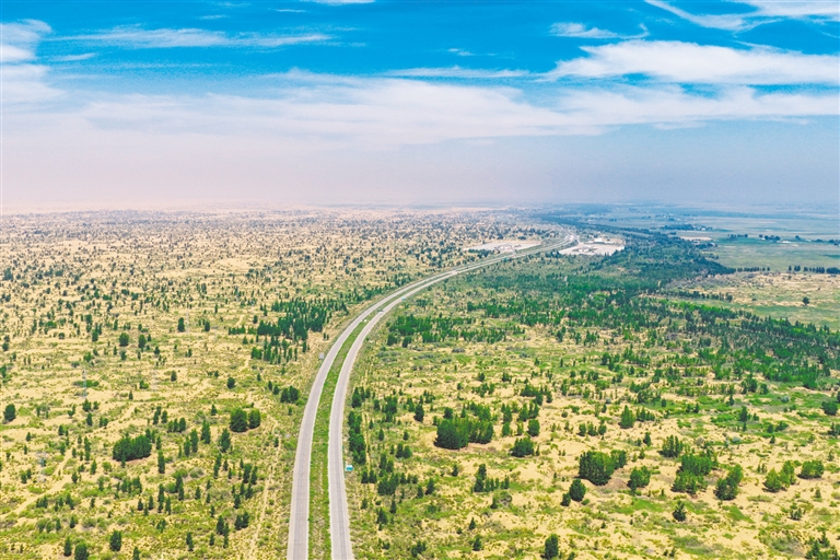 七月的阳光洒在库布其沙漠北缘的林子里,沙柳树、沙枣树、杨柴、柠条等植物迎着光坚韧生长着,在鄂尔多斯市杭锦旗境内形成锁边林带缚住沙海。