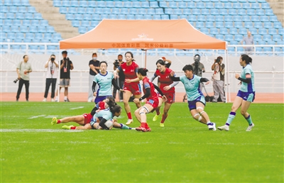 7月4日,橄榄球运动员正在赛场上奋力拼抢。当日,为期3天的第十五届全国运动会7人制橄榄球项目资格赛第二站(落选赛)在呼和浩特体育场开赛。本报记者 孟和朝鲁 摄