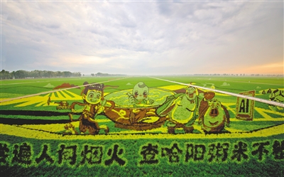 7月4日在北大荒集团黑龙江查哈阳农场有限公司金光管理区拍摄的稻田画(无人机照片)。时下,在“北大仓”黑龙江省的水稻产区,由各种水稻“绘制”而成的稻田画日渐清晰,一幅幅壮美的稻田画卷徐徐展开。 新华社发