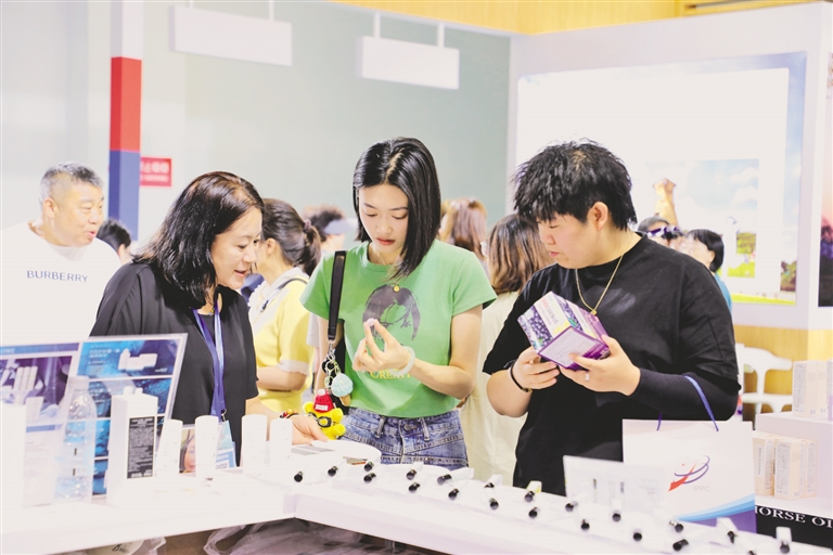 7月6日,一名韩国客商(前左一)在兰洽会上向参会嘉宾推介商品。当日,以“共享机遇,共谋发展,共创繁荣”为主题的第三十一届中国兰州投资贸易洽谈会在兰州开幕。 新华社记者 张智敏 摄