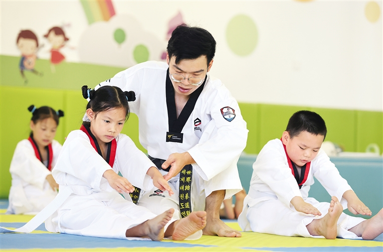 7月7日,在浙江省湖州市德清县乾元镇直街社区青少年宫,孩子在老师指导下学习跆拳道。暑假期间,孩子们参加丰富多彩的活动,充实假期生活。 新华社发