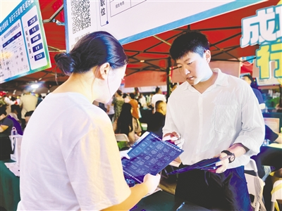 7月12日,求职者(左)向招聘企业了解岗位信息。当日,呼和浩特市回民区人社局在新华广场举办“夜市‘职’通车 灯火照前程”招聘会,吸引众多求职者与招聘企业参与。今年以来,回民区人社局创新“就业服务+夜市经济”模式,进一步拓宽求职者就业渠道。本报记者 丁月浓 摄