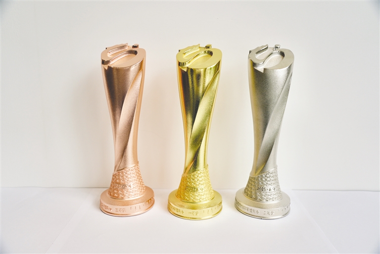 奖杯顶部为会徽“奋进”,以倾斜45度的方式呈现;外形采用扭转升腾样式设计,体现了各民族运动员在少数民族传统体育运动会赛场上英勇矫健的身姿和拼搏向上的精神。底部为红山文化彩陶双旋纹环绕四周,并镌刻“2025·赤峰”,既展现中华优秀传统文化,又明确了本届运动会举办地区及时间,激励各民族运动员以参加本届全区少数民族传统体育运动会为荣耀,传承和弘扬民族传统体育文化,构筑中华民族共有精神家园,铸牢中华民族共同体意识。奖杯整体开模浇铸,锌合金制作,表面电镀金、银、铜颜色。