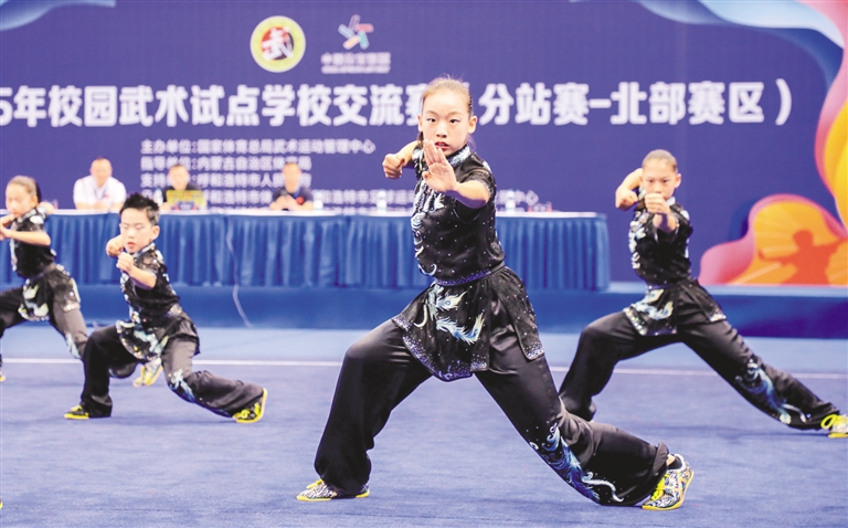 7月17日,参赛选手在比赛中。当日,2025年校园武术试点学校交流赛(分站赛-北部赛区)在呼和浩特体育中心综合馆开赛。来自北京、天津、河北、吉林、呼和浩特的500余名武术少年齐聚一堂,以武会友,共同展示中华传统武术的独特魅力。本报记者 孟和朝鲁 摄