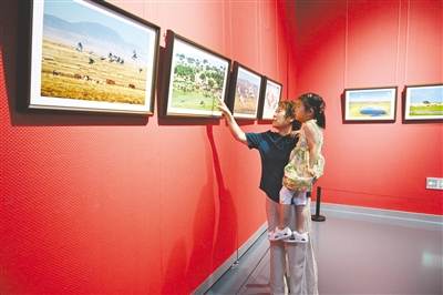 7月18日,观众驻足欣赏摄影作品。当日,“聚焦·浑善达克——浑善达克生态重构摄影展”在内蒙古美术馆开展。展览通过光影艺术生动呈现了锡林郭勒人民在浑善达克沙地歼灭战中取得的丰硕成果,诠释了“三北精神”和“蒙古马精神”融淬出的新时代治沙精神,展现了沙地生态治理的壮丽画卷。本报记者 白雪 摄