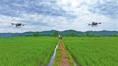 眼下正值水稻生长关键期。连日来,呼伦贝尔农垦扎兰屯农牧场有限公司田间地头一派忙碌景象。两架植保无人机在工作人员操控下,沿着稻田匀速飞行,将肥料转化为细密雾粒均匀播撒,旋翼转动声与翻滚的稻浪交相呼应,共同勾勒出一幅科技助农的生动图景。