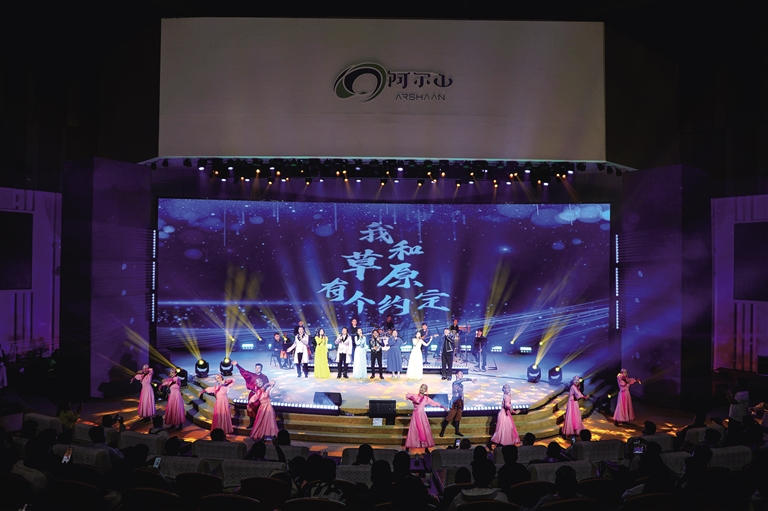 当《我和草原有个约定》响起,全体演员与观众齐声合唱,内蒙古民歌特有的悠长尾音在剧场回荡,观众轻摇哈达形成的蓝色波浪,与舞台上的光影交融成河。“在阿尔山唱歌,和在大剧院不一样。”歌手呼和木其尔说,“这里的风、空气里的草木香,都能让歌声更有生命力。”最初接到驻场演出邀请时,他曾担心重复表演会消磨热情,但首演时观众的眼神让他释然。他说:“每次唱到‘天边有一片辽阔的大草原’,看到台下亮晶晶的目光,就知道这是最生动的舞台。”