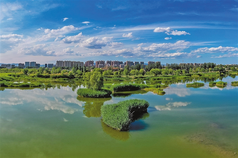 盛夏的呼和浩特市南湖湿地公园天蓝、树绿、水清。近年来,呼和浩特市通过水生态治理、修复等措施,保护湿地资源,改善生态环境和人居环境,不断提升群众的幸福指数。