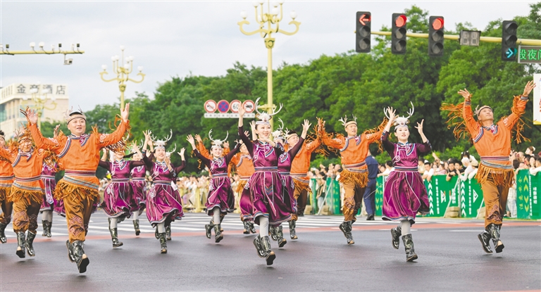 7月29日,舞蹈演员正在表演特色舞蹈。当日,“歌游内蒙古 龙乡赤峰行”嘉年华和文艺展演活动在赤峰市精彩上演,炫酷机车方阵轰鸣而至,时尚花车流光溢彩……为现场观众带来一场精彩纷呈的视觉盛宴。