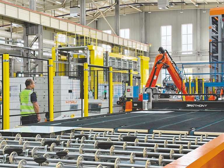 8月1日,走进位于鄂尔多斯市伊金霍洛旗零碳产业园的内蒙古百川光热科技有限公司智能化生产车间,只见生产线高速运转,一面面闪亮的“镜子”源源不断“走下”生产线。百川光热作为全球领先的光热聚光反射镜智能装备制造商,于2022年入驻该产业园,生产的曲面镜和平面镜用于太阳能光热发电,是一种新型太阳能绿色发电方式,更加环保节能。本报记者 潘佳慧 摄