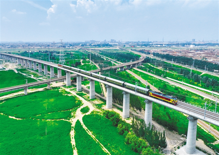 8月2日,检测列车在进行联调联试作业(无人机照片)。当日,包银高铁包头至惠农段联调联试工作正式启动,为包银高铁全线开通运营奠定坚实基础。 新华社发
