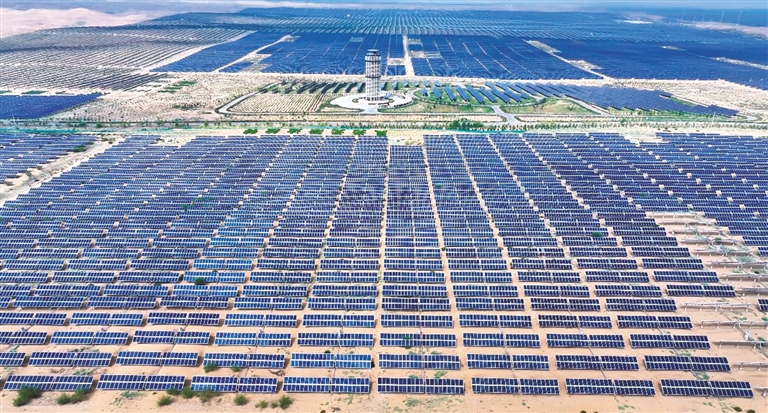 图为8月3日拍摄的位于库布其沙漠的达拉特光伏发电应用领跑基地(无人机照片)。该基地总建设规模100万千瓦,采取“光伏+生态治理+有机农林+沙漠旅游”的模式,每年可生产绿电20亿度,节约标煤68万吨,减排二氧化碳约165万吨。本报记者 潘佳慧 摄