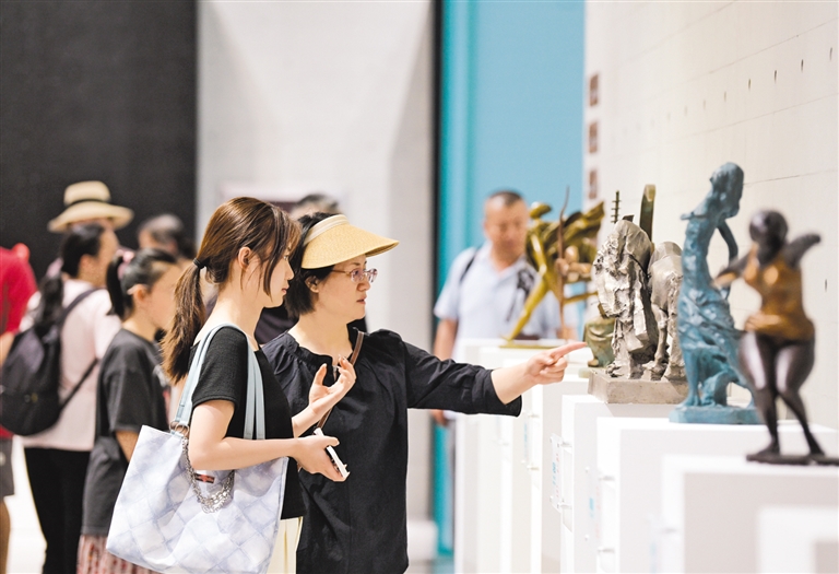 8月3日,观众正在欣赏雕塑作品。第二届呼和浩特国际雕塑艺术展于8月2日在呼和浩特市雕塑艺术馆开展,展览汇集了全球20个国家、80位艺术家的95件精品力作,作品涵盖青铜、石材、复合媒材等多元材质,全面展现了世界雕塑艺术的多元魅力。本报记者 孟和朝鲁 摄
