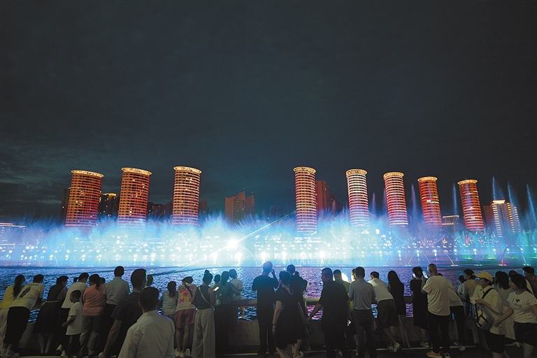 华灯初上,呼和浩特如意河音乐喷泉水姿曼妙,如梦如幻。五彩斑斓的灯光与灵动的水柱交相辉映,伴随着优美的旋律舒展舞动,时而温柔婉约,时而气势磅礴,为广大市民游客呈上夏日里的视听盛宴。