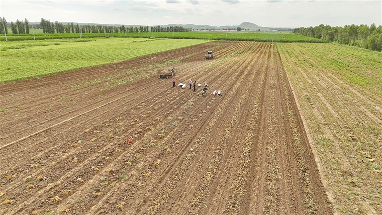 庭院经济的星火,已呈燎原之势。突泉县把紫皮蒜产业作为“土特产”文章的核心篇章,政策资源精准滴灌,擦亮“国家地理标识认证产品”金字招牌。在太平乡金农农业专业合作社的150亩示范田里,理事长宫小朋正带领合作社成员抢收新蒜。“采收时机关乎产量品质,必须争分夺秒。”他身后,新采收的蒜捆在骄阳下铺展成金色画卷。合作社推广覆膜滴灌水肥一体化技术,让传统农活插上科技翅膀。“节水节药又增产,今年亩产1200斤稳了!”宫小朋信心满满。