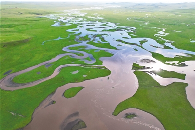 8月的呼伦贝尔大草原·莫尔格勒河景区,老舍先生笔下的“天下第一曲水”蜿蜒曲折,如一条飘逸的绸带在广袤的草原上舞动,河水在阳光的照耀下波光粼粼,与蓝天白云绿草地构成了一幅绝美画面。 本报记者 王智华 摄
