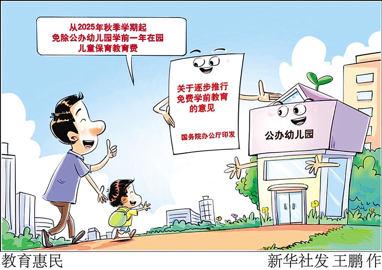 免费学前教育,既牵动千家万户的关切,又承载国家未来发展的考量。国务院办公厅印发的《关于逐步推行免费学前教育的意见》日前对外公布。意见明确,从2025年秋季学期起,免除公办幼儿园学前一年在园儿童保育教育费。新华社发 王鹏 作
