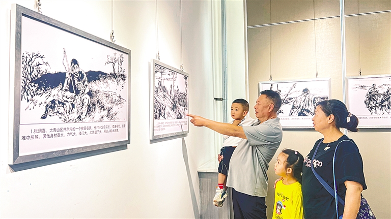 8月15日,呼和浩特市民在参观大青山抗日游击根据地故事红色连环画展。为纪念中国人民抗日战争暨世界反法西斯战争胜利80周年,大青山抗日游击根据地故事红色连环画展自8月14日起在呼和浩特市美术馆青城公园展厅、呼和浩特雕塑艺术馆、武川县新时代文明实践中心同步展出,200余幅连环画生动再现了大青山抗日游击根据地军民同心、团结抗敌的历史场景,本次展览将持续至9月7日。本报记者 孟和朝鲁 摄