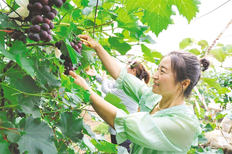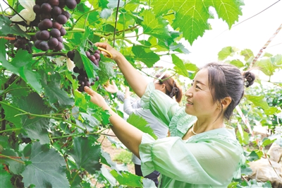 8月16日,游客在采摘葡萄。8月15日,兴安盟突泉县突泉镇新生村举行了第五届葡萄采摘节,活动融合生态农旅与田园乐趣,吸引了千余名游客共享“甜蜜”之旅。近年来,突泉县大力推进农旅融合发展,突泉镇结合实际将葡萄产业与文旅深度融合,推动农民增收和乡村蝶变。本报记者 王磊 摄
