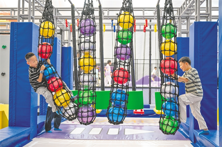 8月15日,小朋友在体验游乐设施。当日,由呼和浩特市文化旅游投资集团打造的“逐光原野运动乐园”在呼和浩特市大黑河军事文化乐园正式开放。乐园以6000平方米气膜穹顶构建未来感空间,配备30余项创新游乐设施,将军事训练元素转化为趣味挑战项目,从而为不同年龄段游客提供独具特色的国防教育新体验。本报记者 王磊 摄
