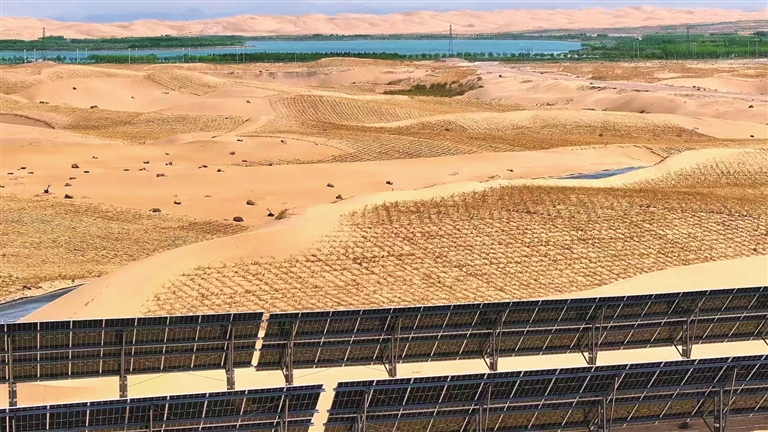 积极推动“新能源+”产业高质量发展,该高新区通过“治沙+光伏”模式的实施,不仅能够减少沙漠化带来的环境压力,还可以逐步扩大黄河“几字弯”攻坚战清洁能源版图,为实现碳达峰和碳中和目标提供典型示范。实施西部荒漠综合治理(二期)、光伏治沙等工程,完成人工种草5.6万亩、工程固沙7.2万亩、退化林修复15.2万亩。阿拉善黄河国家湿地公园二期修复湿地超400公顷。新能源装机规模突破550.643万千瓦,年发电量95.72亿千瓦时,相当于减排二氧化碳756.24万吨。
