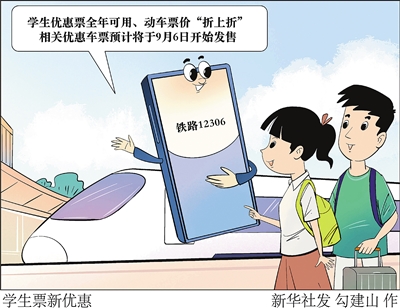 近日记者从中国国家铁路集团有限公司获悉,铁路部门将优化学生旅客购票出行措施,推出学生优惠票全年可用、动车票价“折上折”,让学生购票出行更加灵活方便、得到更多实惠。相关优惠车票预计将于9月6日开始发售。 新华社发 勾建山 作
