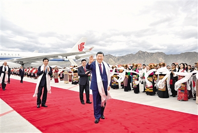 西藏自治区党委书记王君正、自治区人大常委会主任严金海、自治区人民政府主席嘎玛泽登、自治区政协党组书记刘江等在舷梯下迎候。■下转第3版 ■上接第1版 习近平走下舷梯时,王君正敬献哈达,礼仪人员敬献切玛和青稞酒。各族群众代表身着节日盛装,挥动红旗和五彩花束,跳起欢快的民族舞蹈,欢迎总书记的到来,表达对总书记的衷心祝福。
