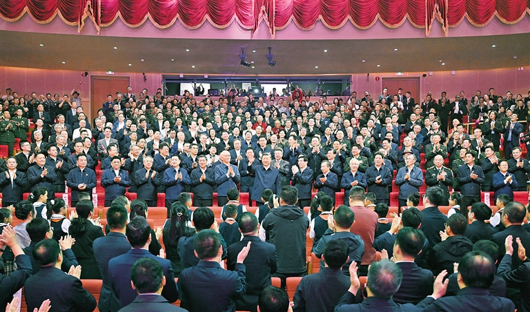 王沪宁、蔡奇、李干杰、何立峰、张国清、王小洪、洛桑江村、胡春华和张升民,在西藏工作过的老同志,以及中央和国家机关有关部门负责同志、中央代表团全体成员一同观看演出。