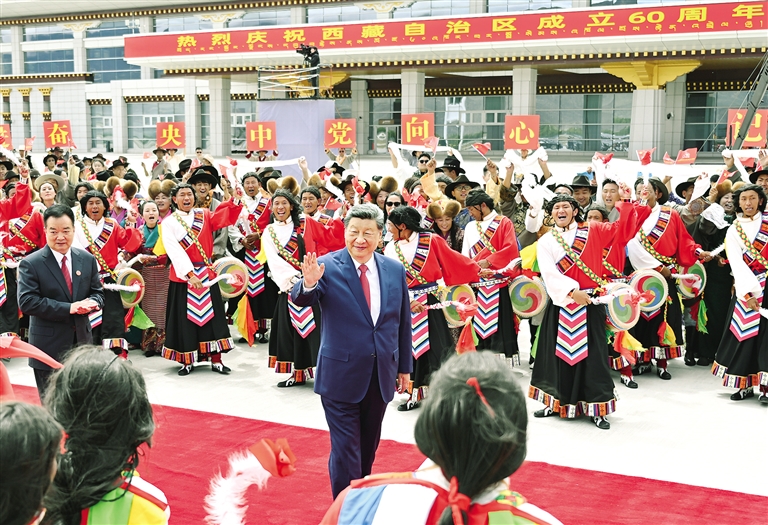 习近平离开西藏时,各族群众纷纷来到拉萨市区的沿途道路两旁,挥舞红旗、手捧哈达,欢呼着向总书记问好,■下转第4版  ■上接第1版  向总书记表达由衷的爱戴。拉萨贡嘎机场,身着节日盛装的干部群众挥舞着红旗和花束,载歌载舞,高喊“扎西德勒”,表达高原儿女对以习近平同志为核心的党中央的感激之情、对建设社会主义现代化新西藏的坚定信心。