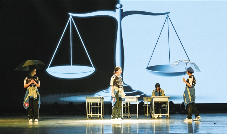 8月22日,鄂尔多斯代表队的师生在表演法治情景剧《法槌敲响:校园欺凌的警示钟声》。当日,由自治区教育厅主办的内蒙古自治区2025年大中小学法治情景剧决赛在内蒙古艺术学院举行。本次比赛共有12支队伍参加,他们以剧普法,用生动的故事、真挚的情感,为观众展开一幅“学法、懂法、守法、用法”的青春画卷。本报记者 王磊 摄