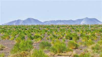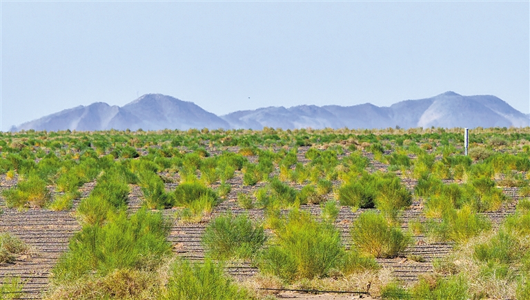 8月下旬,已入秋季,阿拉善盟额济纳旗的气温依旧居高不下。烈日炙烤着大地,一株株嫩绿的梭梭顽强生长,让一望无际的沙地上有了生机。